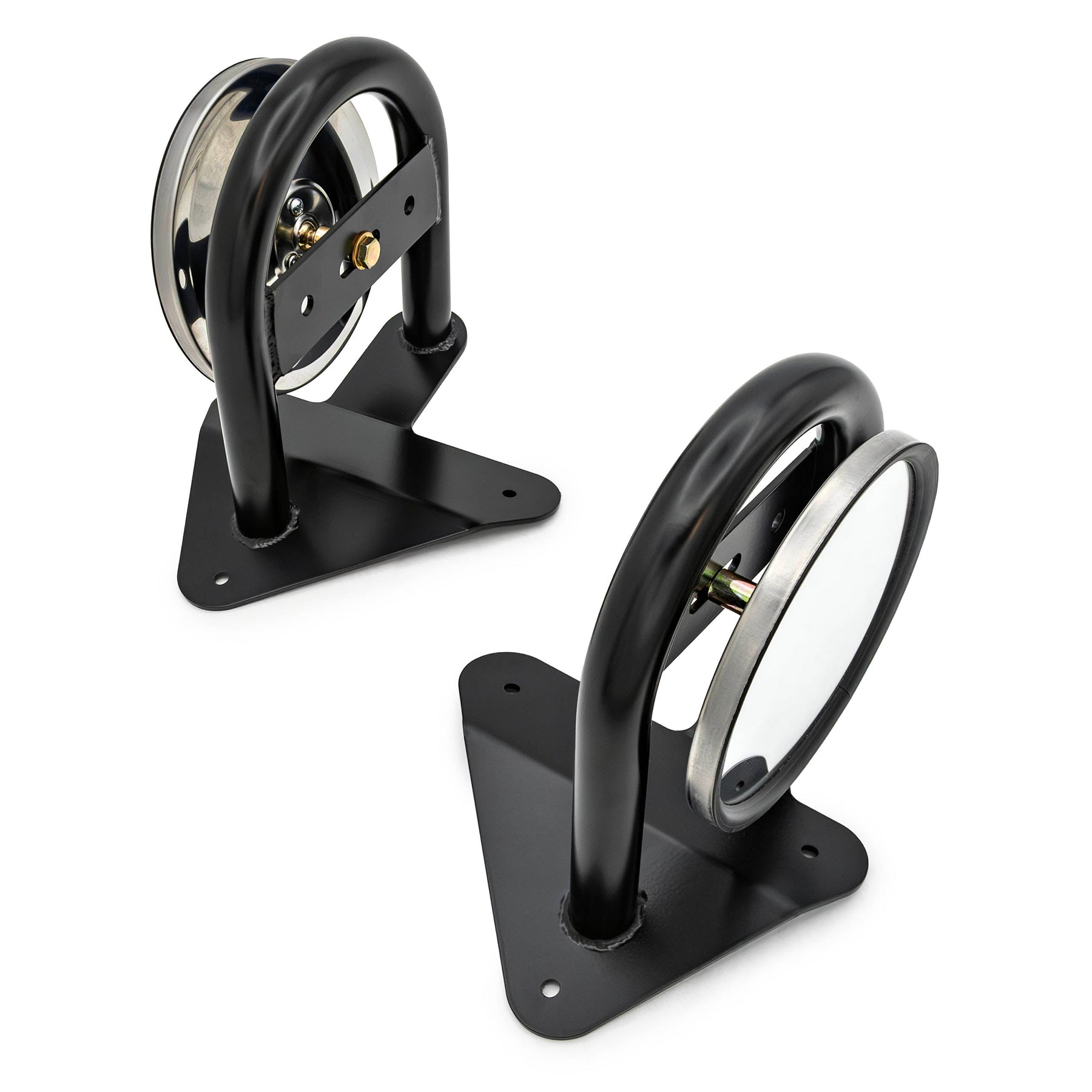Are you sick of cheap plastic stock mirror flopping around while on the trail? Then these race inspired mirror brackets are just what you're looking for. Requiring minimal modification to install, they fit Broncos and F-Series trucks in the 80s & 90s with the power mirrors from factory (5 3/4" center hole to center hole spread) by locating off two factory holes on the door while the third hole must be drilled (make sure window is rolled up before drilling!) Extra bolt can be installed with supplied nutsert or nylock bolted from the backside of the door. Made from 1/8" plate steel press broke to shape and .095 1" tubing for mirror protection. If your truck came with the "trucker" mirrors then the bolt holes will not line up. You can make them work by drilling the holes if you want.