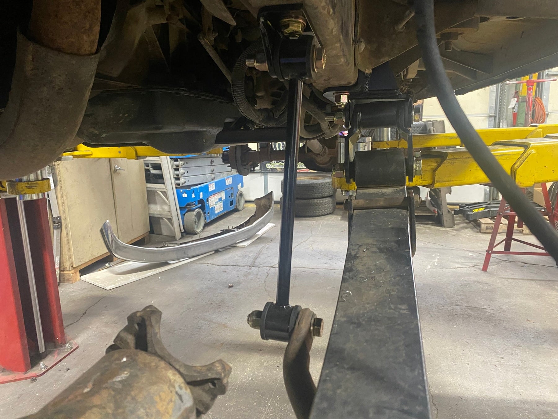 -Allows the use of the factory axle mounted Ford Super Duty 99-04 sway bar link by converting the 92-97 system to a eye style link with a mounting bracket on the frame.