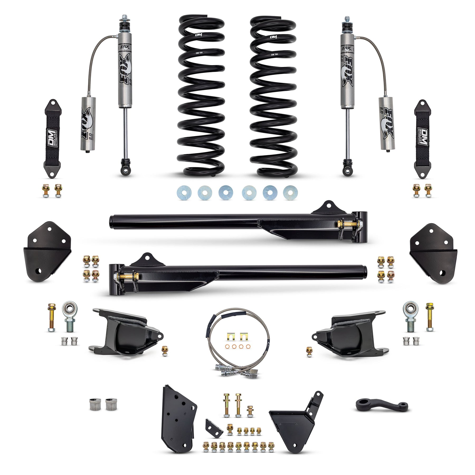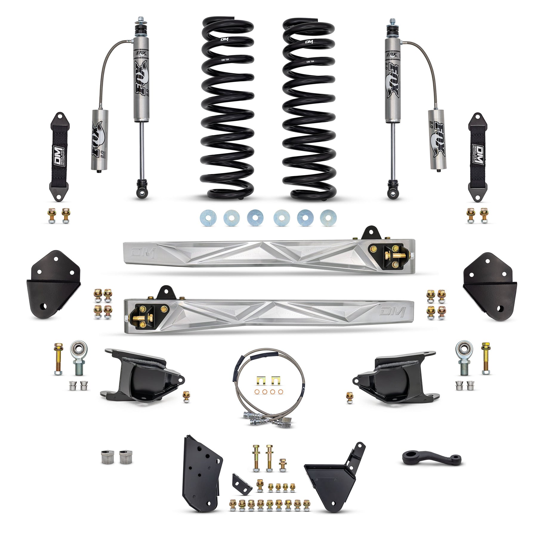 Designed for the performance-driven enthusiast, this 4" front lift kit offers a fully bolt-on solution for your 2WD F-250 or F-350. This kit will lift the front end for increased clearance and improved stance needed when fitting a tire larger than stock size. Utilizing the same extended radius arms as other Desolate Motorsports suspension kits, both steel and billet options provide enhanced performance and drive characteristics. Bilstein 5100 or optional Fox 2.0 shocks provide a much better ride than stock and mild drop pitman arm is included to correct steering geometry. All other components required for installation such as brake lines, bracketry, and limit straps are included.