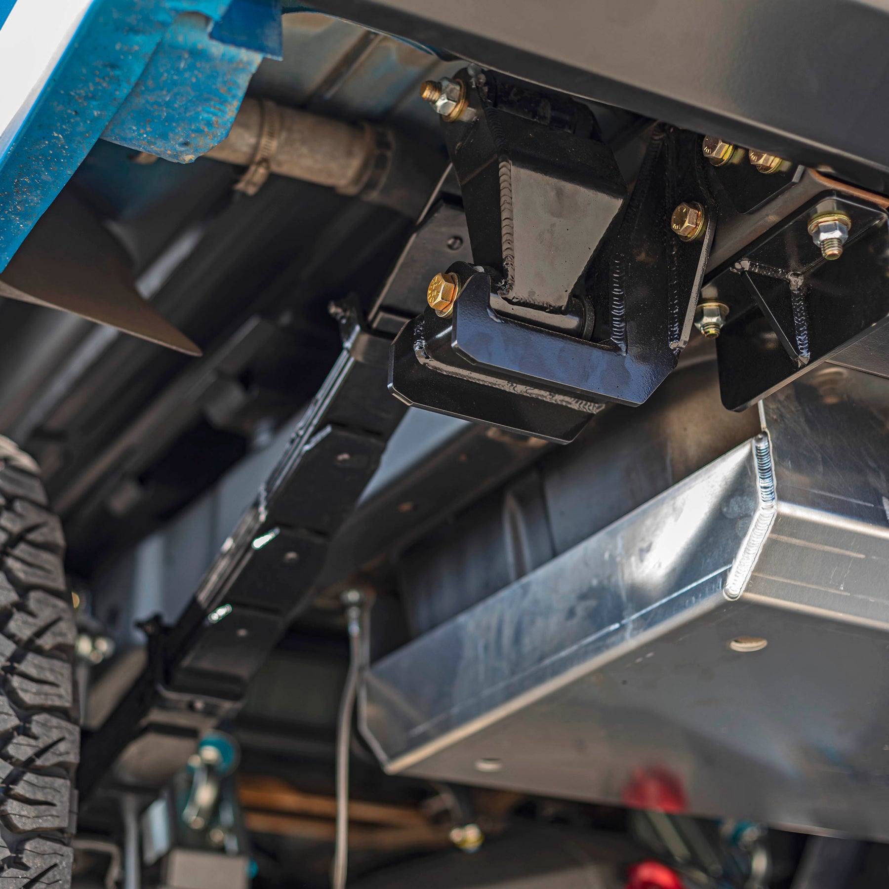 These extended shackles are CAD designed, laser cut, formed, and precision welded. They are longer length than the stock shackles and allow for maximum wheel travel and additional droop on leaf springs with increased free arch. These fit the OEM 3″ wide leaf springs and other similar aftermarket springs.