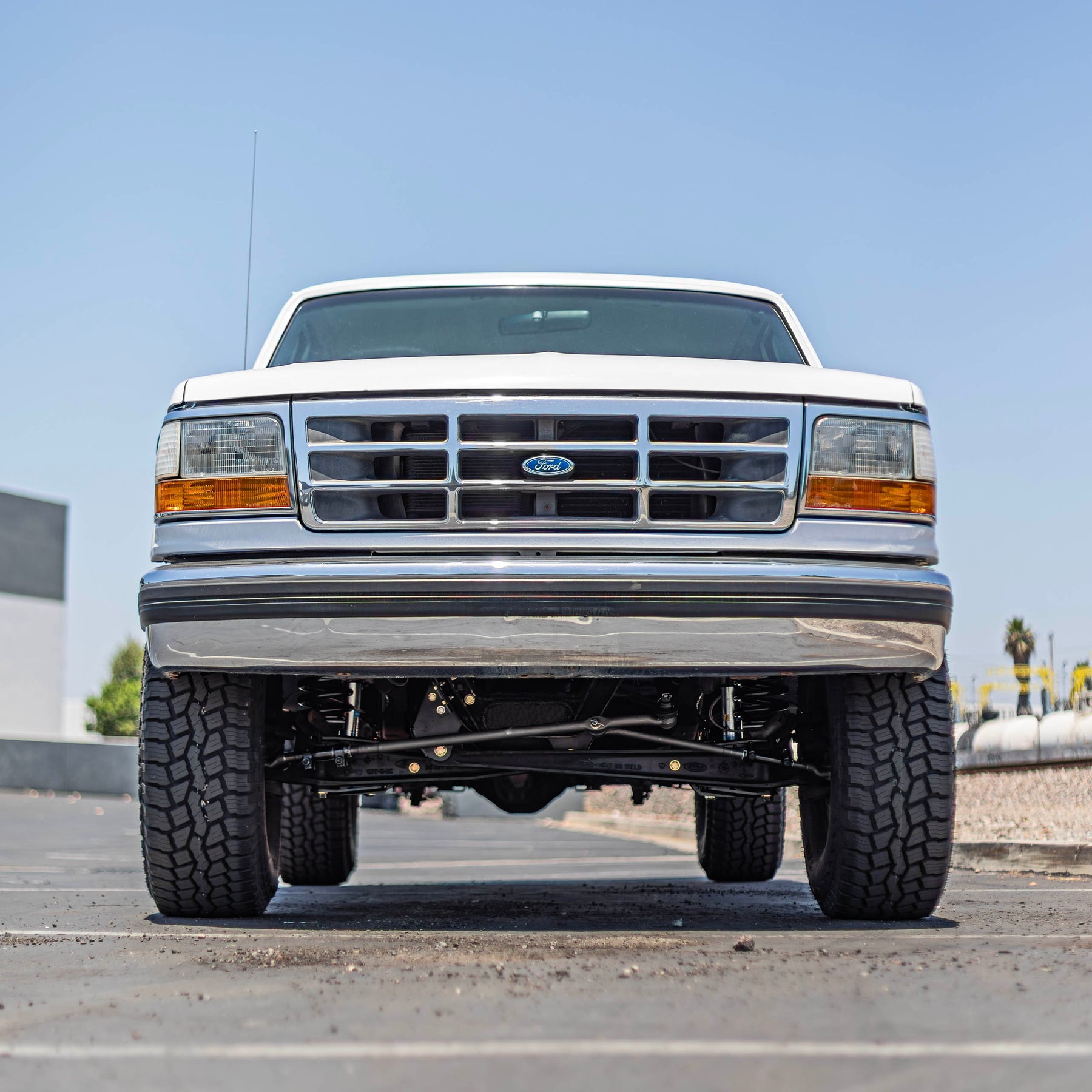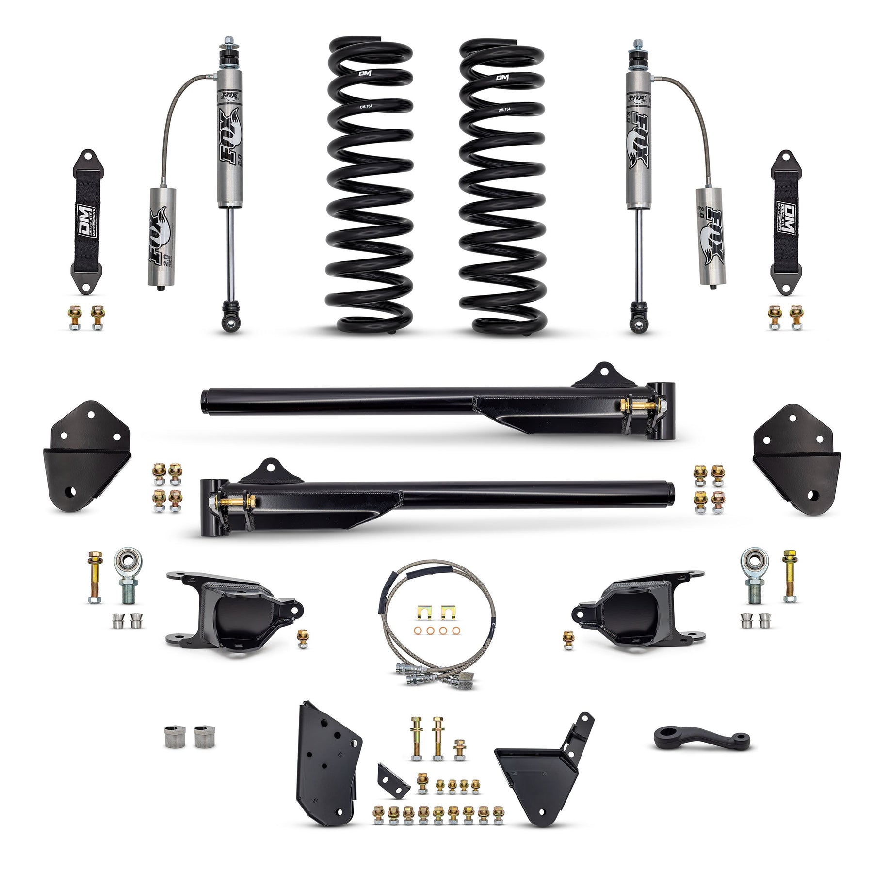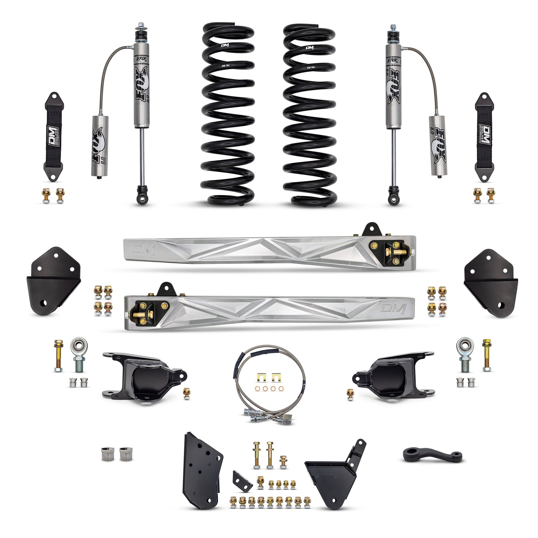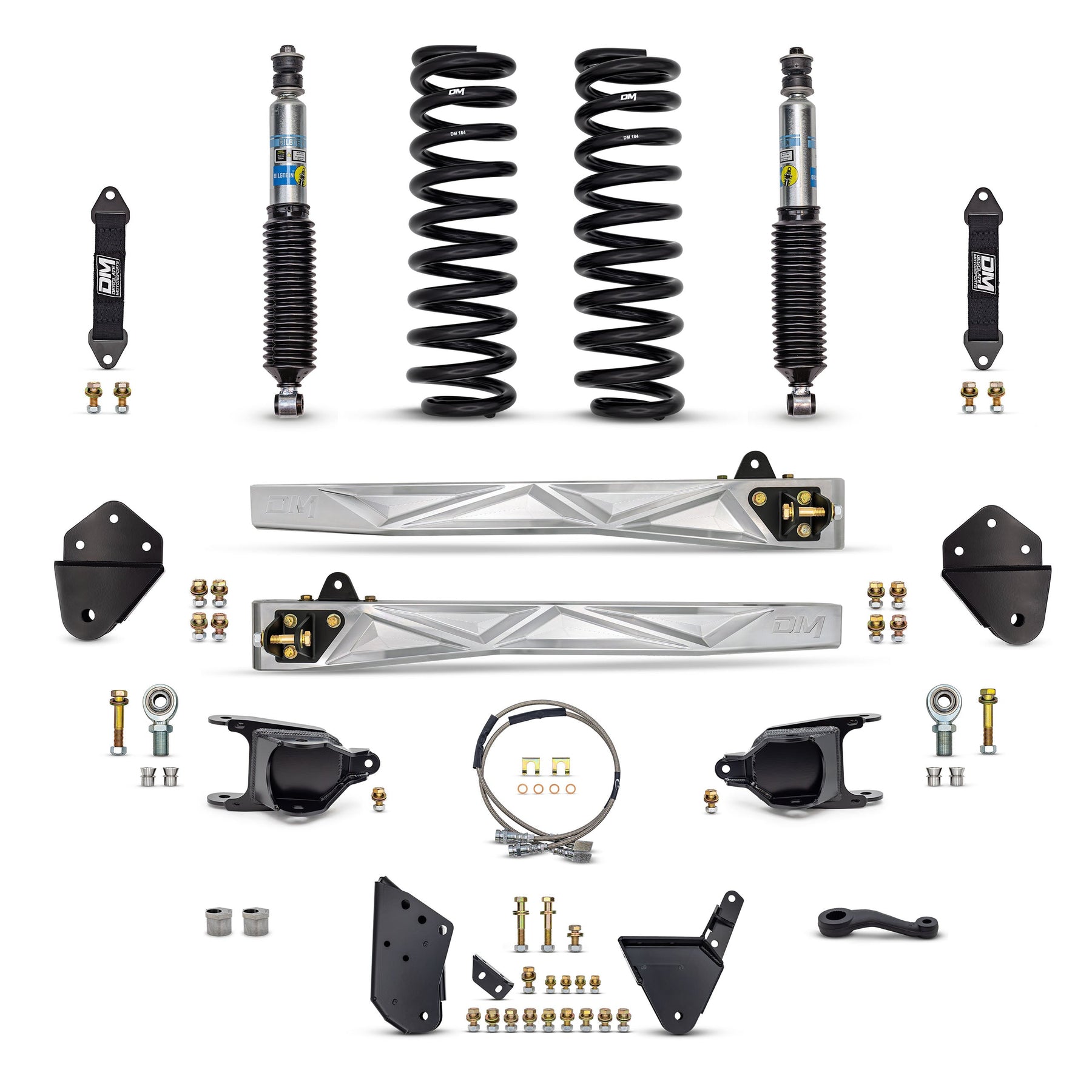 Designed for the performance-driven enthusiast, this 4" front lift kit offers a fully bolt-on solution for your 2WD F150. This kit will lift the front end for increased clearance and improved stance needed when fitting a larger than stock size tire. Utilizing the same extended radius arms as other Desolate Motorsports suspension kits, both steel and billet options provide enhanced performance and drive characteristics. Bilstein 5100 or optional Fox 2.0 shocks provide a much better ride than stock and mild drop pitman arm is included to correct steering geometry. All other components required for installation such as brake lines, bracketry, and limit straps are included.