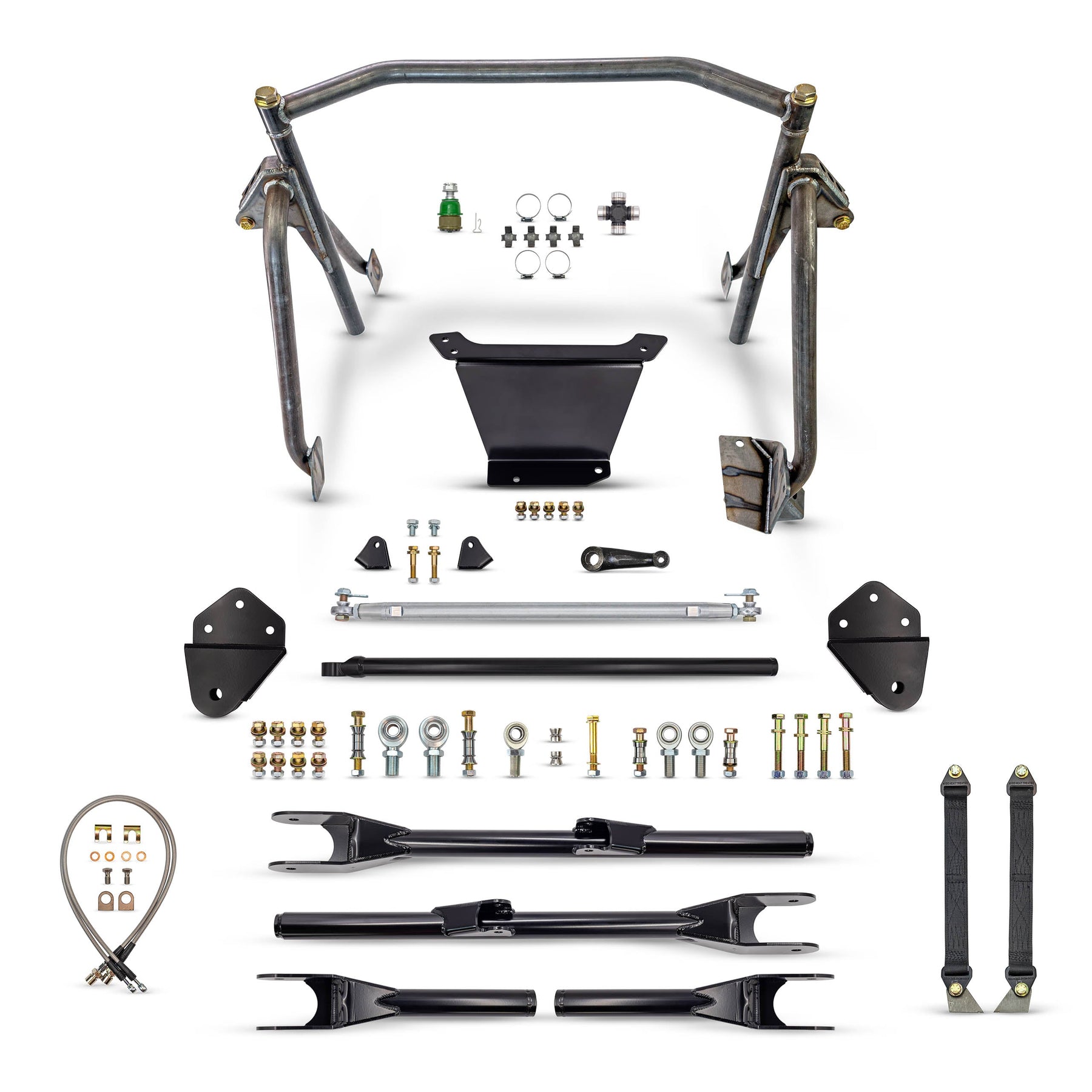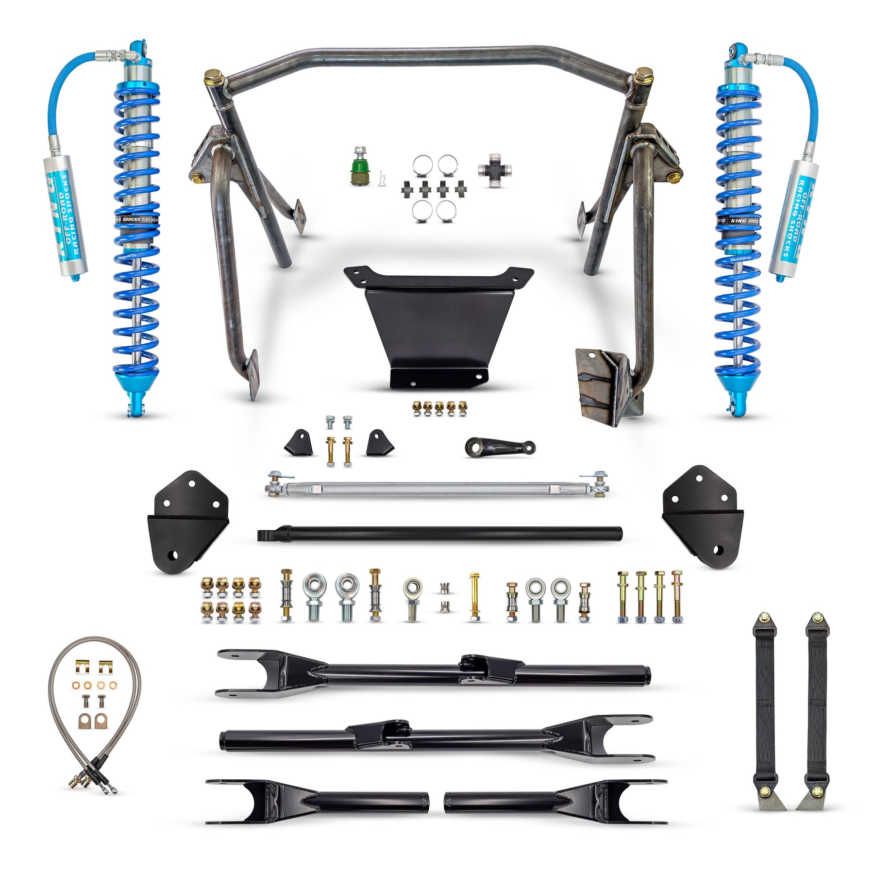 Note: All link arms and brackets come powder coated black now! Shock tower is still raw because it requires welding.