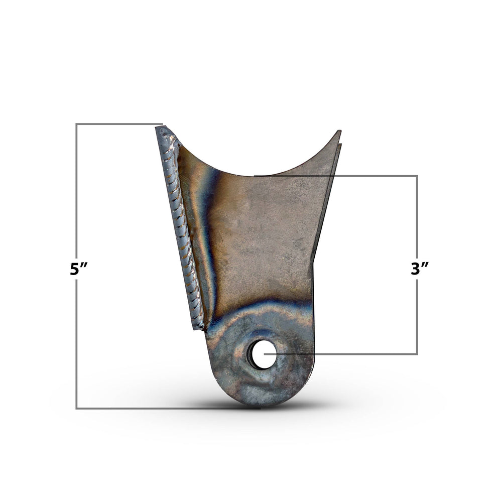 Cut from 3/16" plate steel, these mounts have a radiused bottom, designed to fit flush to the axle housing. This allows you to install at any angle. They weld directly to a 3.250” axle tube but can be modified to fit larger housings. Distance from the axle tube to the shock mounting holes is 3” and uses a 1/2” bolt to attach the shock. Use these for mounting race style shocks with 1.5” mounting spread.